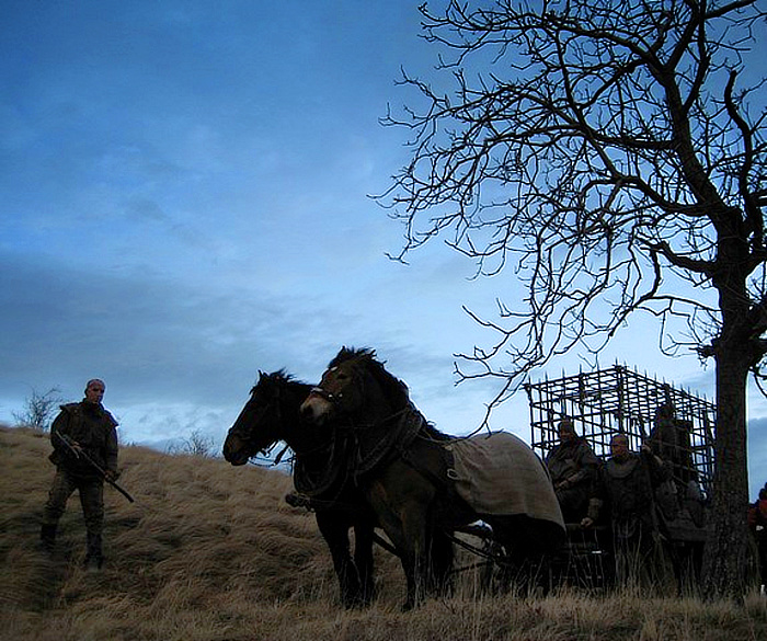 Solomon Kane’s England reflects both the macrocosm of Howard’s godless universe and the microcosm of Kane’s soul. Barrett depicts Somerset as an all but barren wasteland completely devoid of warmth or shelter. There is no sovereign power to protect the people from the depredations of a satanic warlord and there are no towns where people might find refuge. Instead there are only burned out buildings, gallows filled with hanged men and the wonderfully bleak cinematography of Dan Laustsen (who also worked on 2001’s Brotherhood of the Wolf). It is a land that offers no safety and no protection from the evils of the world. Evils that very obviously exist. Indeed, aside from the magical creatures that Kane has to combat, Kane’s world is also one in which the taint of evil upon a man’s soul has a very physical manifestation. When Malachi’s lieutenant recruits men to his army, he transforms their bodies with a touch, physically manifesting the rotten and depraved condition of their souls.