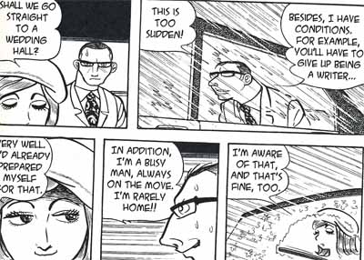 The metaphorical nature of The Book of Human Insects is also evident from Tezuka’s style of art. Those used to the more uniform Big Eye style of contemporary manga might fall into the trap of seeing Tezuka’s artwork as primitive or overly cartoonish. However, look beyond the rubber-legged foreground characters and you will find not only extraordinarily detailed and ‘realistic’ backdrops but a capacity to change modes of composition to denote the manga equivalent of dream sequences and moments of heightened reality. Consider, for example, Tezuka’s use of traditional cartoon iconography in this seduction: