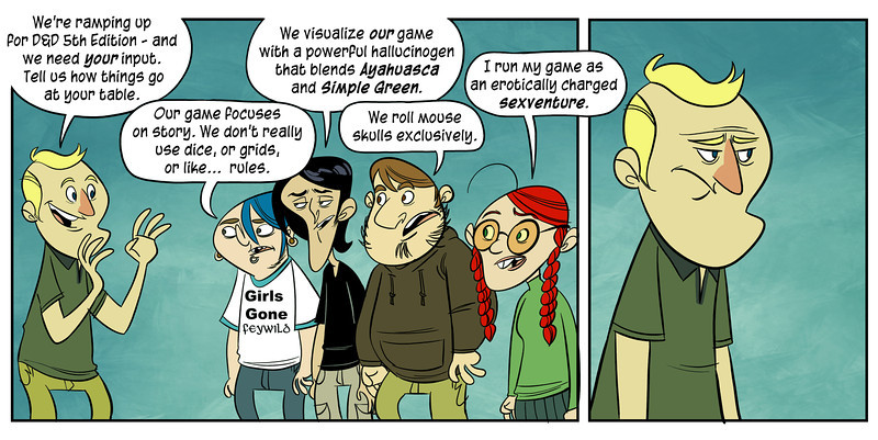 The decision to pander to tacticians has had devastating repercussions on the hobby at large as Dungeons & Dragons remains the only RPG with enough visibility to serve as a shop window for the hobby as a whole. In the early 1980s, D&D was simple enough to be understood by children and the game was available in every toy store and bookshop in the English-speaking world. By the 2010s, D&D had become a game so narrowly focused and mechanically complex that the only people capable of making sense of it were the grown-up versions of the same socially inept teenagers who had already forced everyone else to flee the hobby. Nowadays, it is almost impossible to find a game unless you are already part of a group. The hobby is so small that little infrastructure exists to support the search for local players and those players who do build successful groups tend to advertise only as a last resort, lest they be invaded by men who smell like piss and Nazi memorabilia.